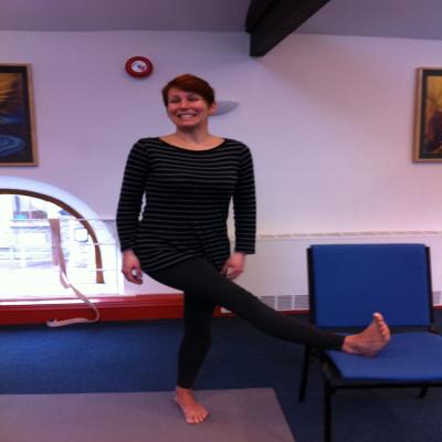 You'll notice that her foot on the floor is facing forwards which is good. Her trunk is drifting towards the chair which is human but not so good and her foot on the chair ought to be pointing upwards heavenwards. That for most of us is the hardest part.
